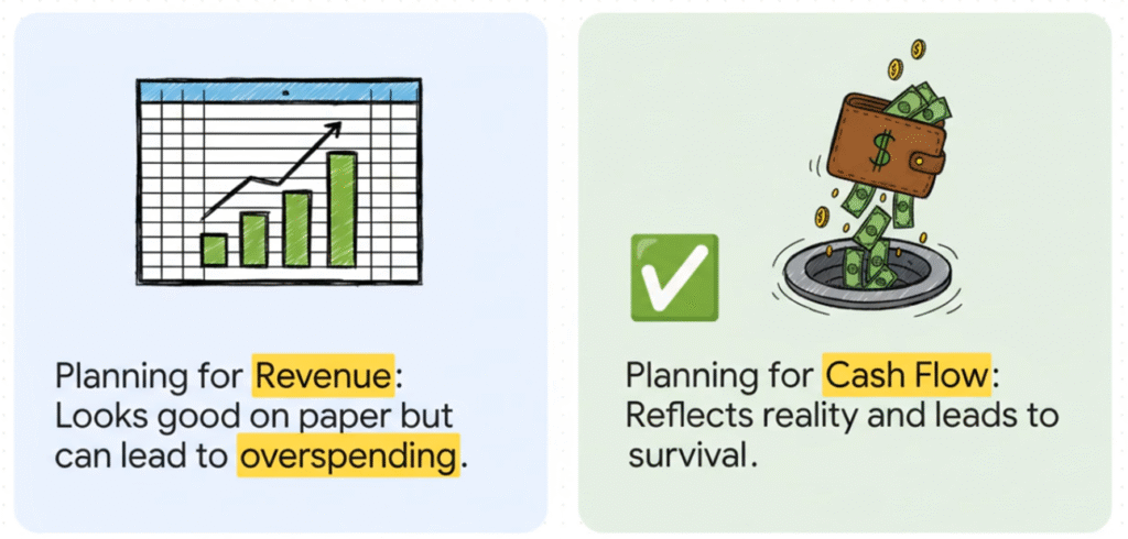 By month two, you’d burned through $8,400 of your $12,000. You still have bills of $4,200 but only $3,600 left. So you put it on a credit card. By month four, you’re paying 22% interest on $3,800 of debt even though you’re “profitable.”