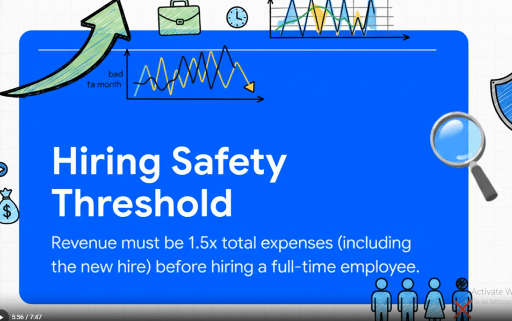 Never hire full-time employees until your revenue is 1.5 times your total expenses including the new hire.