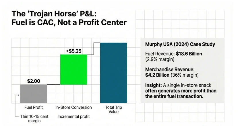 Don’t expect fuel itself to be profitable. Retailers who enter fuel thinking they’ll make money selling gasoline always fail. Murphy USA (Walmart’s fuel partner) made $18.6 billion in fuel revenue in 2024 but only $537 million in fuel profit—a 2.9% margin. The real profit came from $4.2 billion in merchandise sales at those same locations, with 36% merchandise margins.