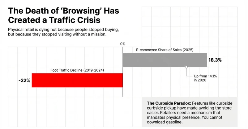 Retailers tried everything—better apps, curbside pickup, loyalty programs—but these just made avoiding the store easier. Curbside pickup literally means “drive up, grab your order, leave without entering.” That’s the opposite of what retailers need.