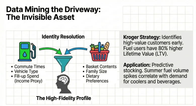 Retailers entering fuel business gain tracking of weekly customer visits, purchase patterns, and cross-channel behavior. Fuel creates 26–52 annual touchpoints versus 12 for monthly shoppers. This data enables predictive inventory management, personalized marketing based on fuel buying patterns, and identification of high-lifetime-value customers early in their relationship.