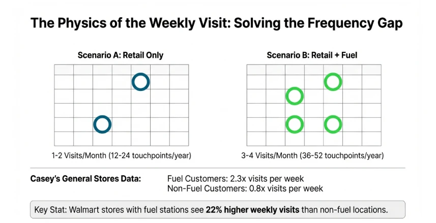 Casey’s General Stores built their entire business model around this. They operate 2,600+ locations across the Midwest, and every single one combines fuel with prepared food and groceries. Their 2024 annual report showed fuel customers visit 2.3 times per week on average, compared to 0.8 times per week for non-fuel convenience stores in the same markets. That’s 3x more frequent customer contact.