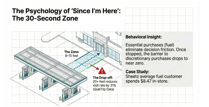 The mechanism: fuel creates routine visits, routine visits build shopping habits, and habits drive incremental spending. Someone who visits weekly for fuel starts remembering your store for quick grocery needs. Instead of planning a separate Costco trip, they grab milk and eggs during their fuel stop. Those unplanned convenience purchases add up.