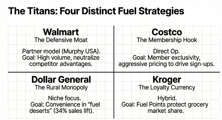 Grocery chains (Kroger, Walmart), warehouse clubs (Costco), and discount stores (Dollar General) are the primary retailers entering fuel business successfully. These retailers use fuel to drive weekly traffic, increase customer frequency, and boost in-store sales. The model works best for retailers with existing large-format stores and sufficient parking space for fuel infrastructure.