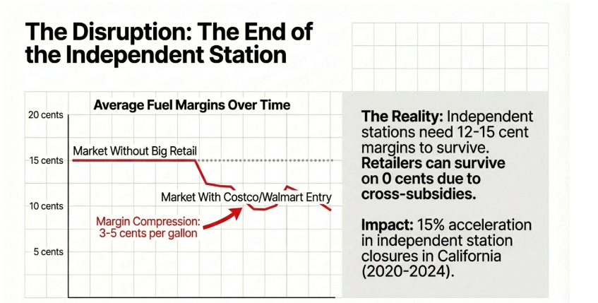 Market entry effects: when major retailers add fuel, independent stations and chains must respond with price cuts to maintain volume. Studies show fuel prices in markets where Costco operates run 5-12 cents below markets without Costco presence.