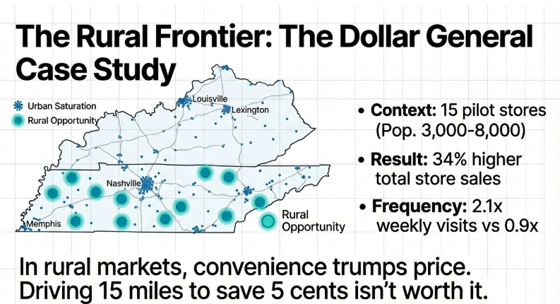 Dollar General’s rural fuel strategy demonstrates this. Their test stations in Tennessee and Kentucky towns (populations 4,000-7,000) saw massive sales lifts because they became one-stop destinations for communities with limited options. Residents who previously drove 15-20 miles to Walmart now shop locally.