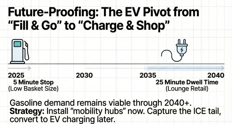 Retailers entering fuel business are adding EV charging infrastructure alongside gasoline pumps, creating “mobility hubs.” This hybrid approach serves both vehicle types during the transition. Since gasoline demand remains strong through 2035–2040, current fuel investments pay back before EVs significantly impact demand. EV charging also creates longer customer dwell time (20–30 minutes), increasing in-store shopping opportunities.