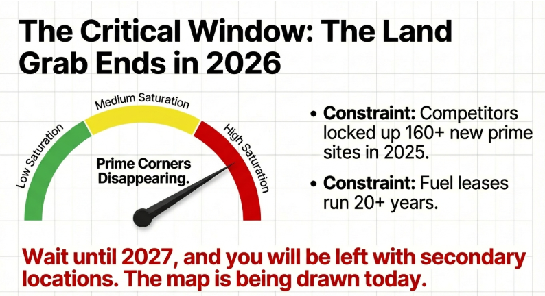 The 2026 timing matters because it represents a closing window. Prime locations are disappearing, competitive advantages are widening, and customer habits are forming. Retailers acting now capture 10-15 years of strong returns before EV transition significantly impacts gasoline demand. Those who wait miss the opportunity entirely as competitors claim the best sites and lock in customer loyalty.