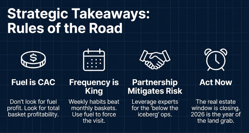 The real profitability comes from customer conversion and basket building. Retailers entering fuel aren’t trying to make money selling gasoline—they’re investing in customer acquisition and frequency. Think of fuel stations as expensive customer acquisition channels that also happen to generate small amounts of revenue while pulling customers in.